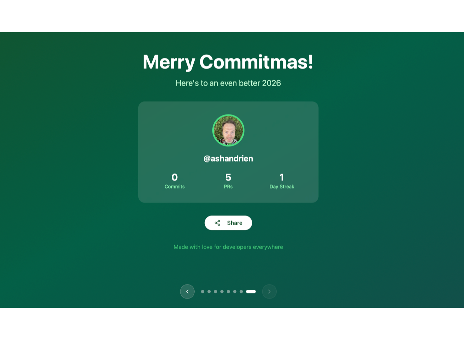 A "Spotify Wrapped" style year-end review of public Github contributions. Great for celebrating the year that was with your engineers. I'm working on making it available to private repos.