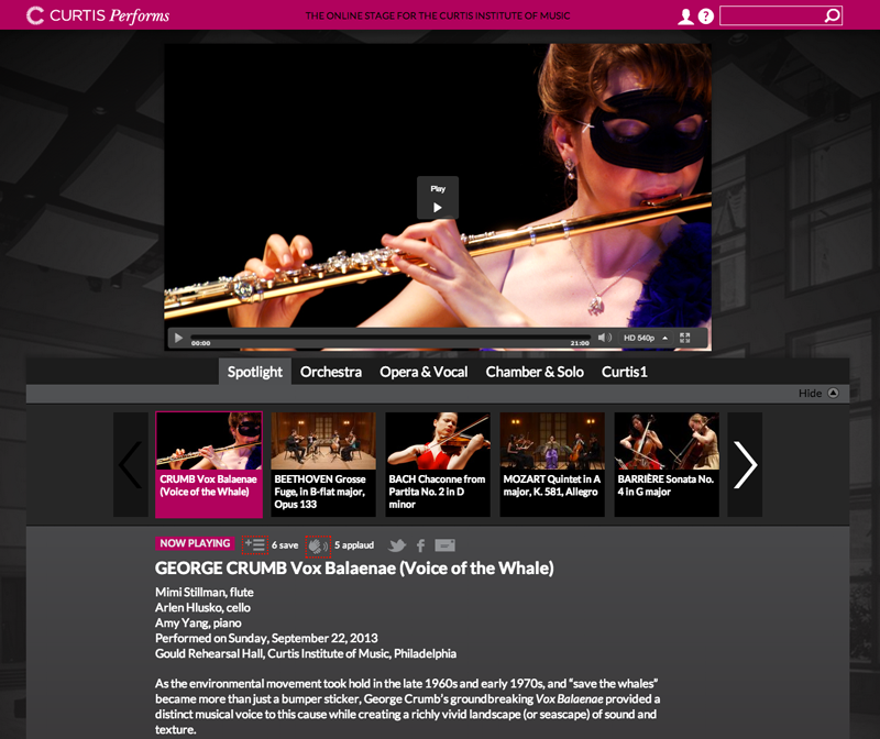 Curtis School of Music in Philadelphia wanted a site where video of student performances could be broadcast over the web. Built on the Drupal CMS framework, we chose a live streaming service, Kaltura, to manage live streaming. Since performances would be viewable on a large range of devices, there was a good deal of user testing. The result is cinematic, intimate, and educational.