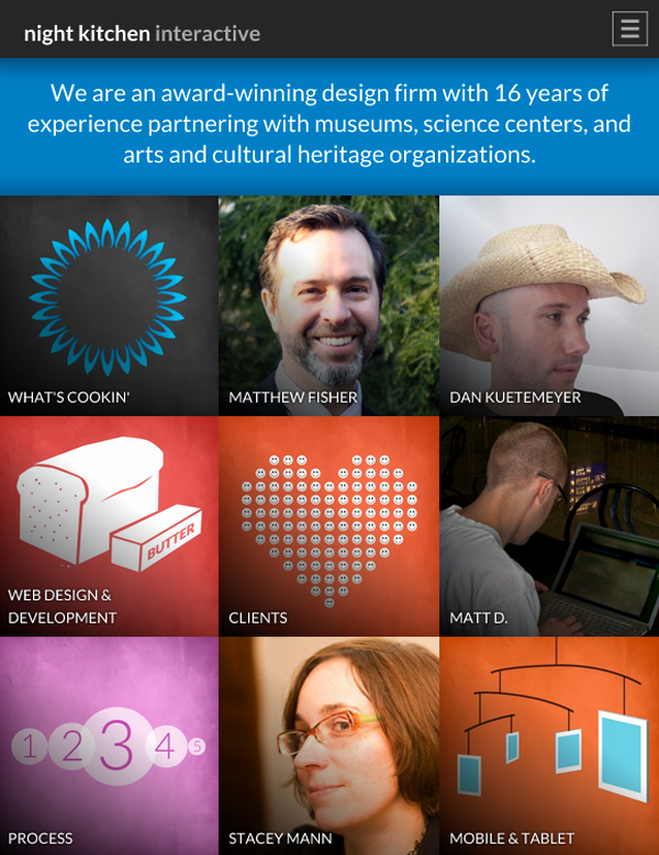 Night Kitchen was long overdue in updating their wordpress website to showcase their expansive portfolio of work, and they wanted something responsive, unorthodox, and visual. Housed on the Drupal content-management system, the site uses a tile-based structure which responds to various viewports and devices. I used the Bourbon/Neat SASS library for the site's fluid grid.